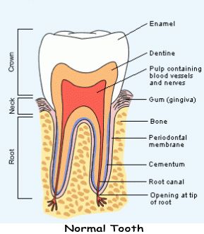 - Dentin: below the enamel it consist organic component which are made up of many tubules. It is cover by enamel in crown portion and cementum in root portion. Any exposed part to mouth cause sensivity due to wearing or decaying of enamel or cementum. Dentinal tubules run from enamel or cementum towards the pulp. At the pulp end of the dentinal tubules consist of nerve fibres which are responsible for causing sensivity. These dentinal provide nourishment for dentin and helps enamel from breaking because it is resilient in nature.